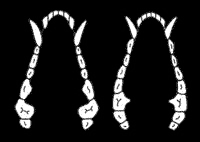 上颌有20枚齿,其中切齿6枚,犬齿2 枚,前臼齿8枚,后白齿4枚;下颌有22枚齿,其中切齿6枚,犬齿2枚,前臼齿8枚,后臼齿6枚。共计42枚齿。