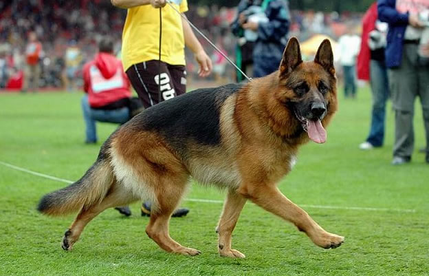 德国牧羊犬的基本步态是交互举起前右脚与后左脚而快走或小跑。要达到这种步态,犬的四肢必须在行进中保持身体两侧的平衡,犬在前冲过程中,犬的后腿要达到犬的身体的中点,两条后腿距前腿的距离一定要相等,同时犬在前冲时身体的背线没有明显的改变。德国牧羊犬的体高与其四肢比例适当,只有这样犬才能在做大跨越是显得轻松自如。犬在前冲时头部向前,尾巴微微上翘,动作舒展平衡,从耳朵尖经过背部直到尾巴尖形成一条弧线。